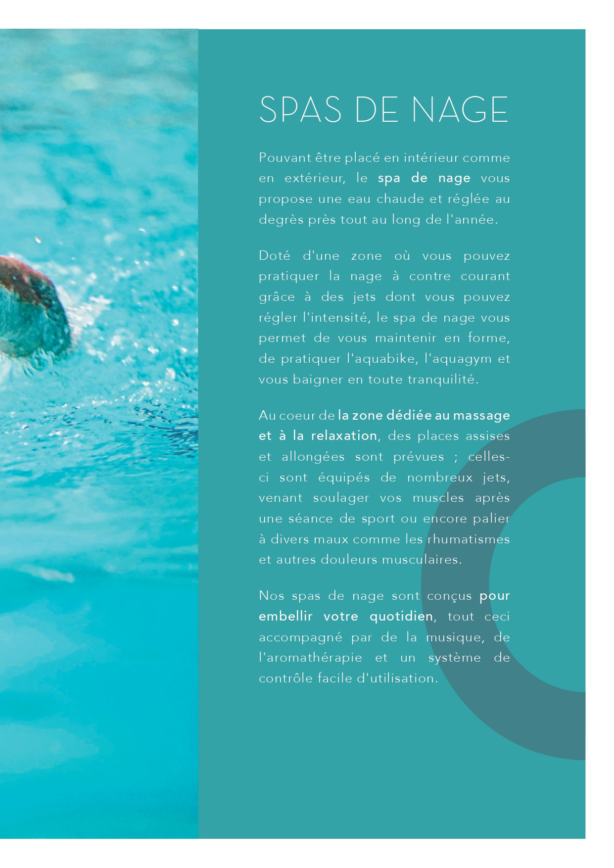 Doté d'une zone où vous pouvez pratiquer la nage à contre courant grâce à des jets dont vous pouvez régler l'intensité, le spa de nage vous permet de vous maintenir en forme, de pratiquer l'aquabike, l'aquagym et vous baigner en toute tranquilité.